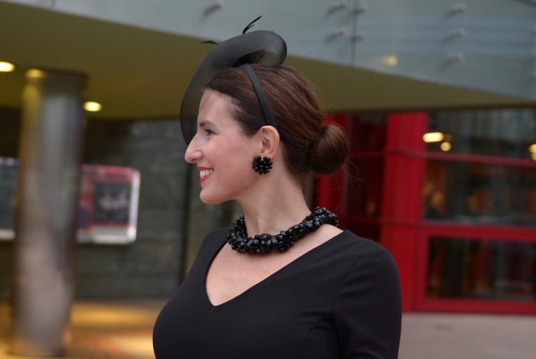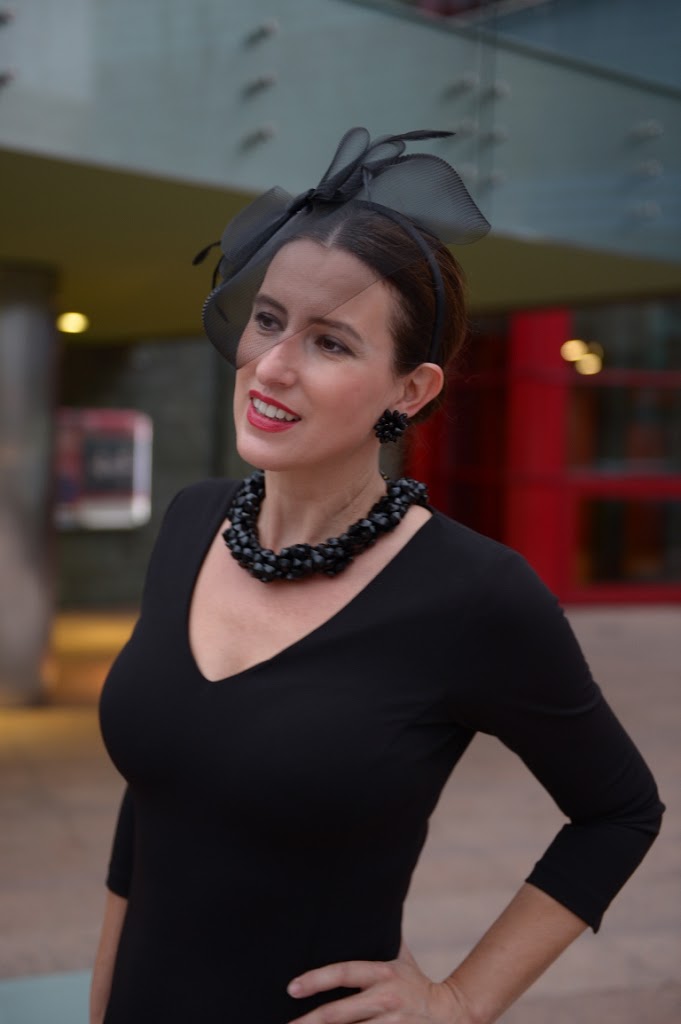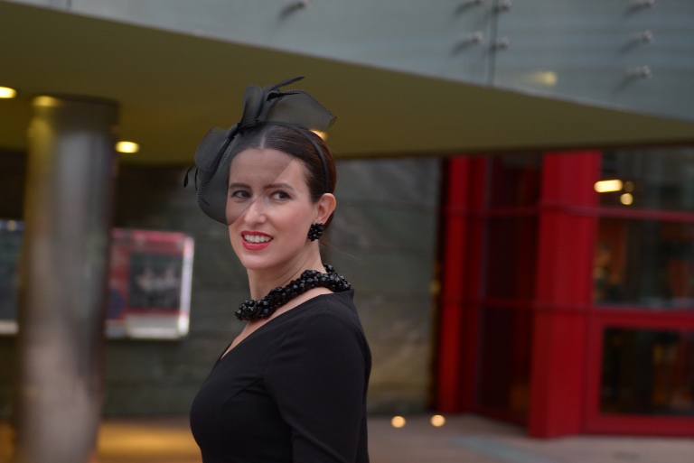 Z jednej strony bardzo ładnie. Ale – czy ta sukienka nie jest z dzianiny? Zgadzam się, że kolczyki takie wyraźne, zbędne. Szpilki i fascynator super.