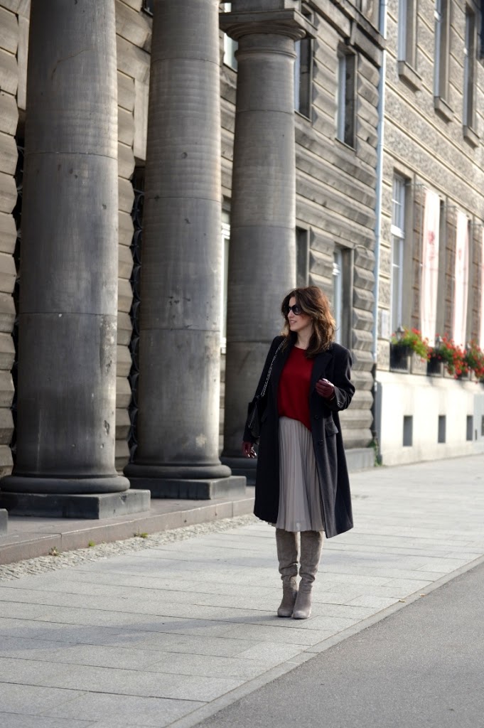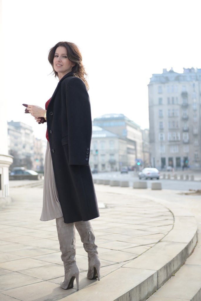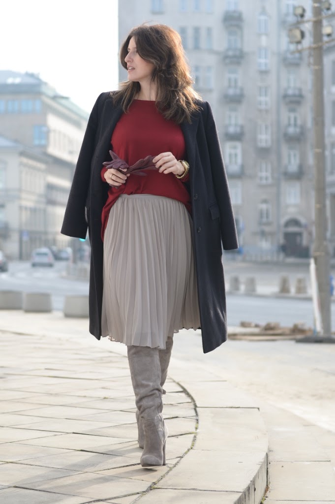 Zdecydowanie jestem za takim mniej oficjalnym wyglądem, chociaż wspaniale wyglądasz w obu wersjach. Burgund i szarości? Nie spodziewałam się że będzie tak do siebie pasować. Do tego taka spódnica i kozaczki. Misz masz, ale jaki efekt! Wspaniale 🙂 pozdrawiam