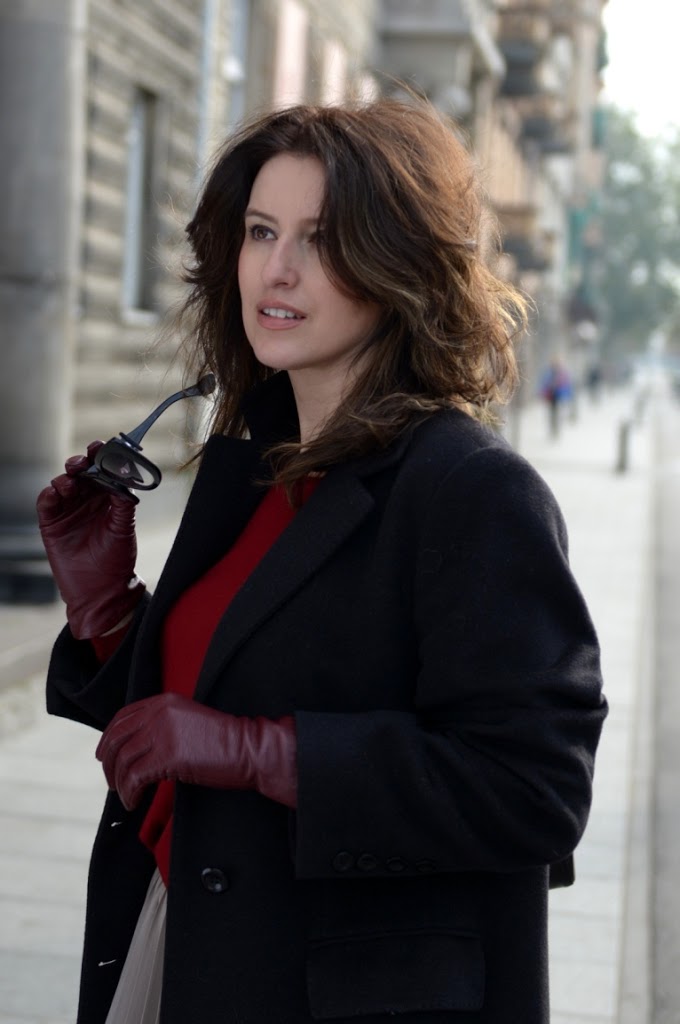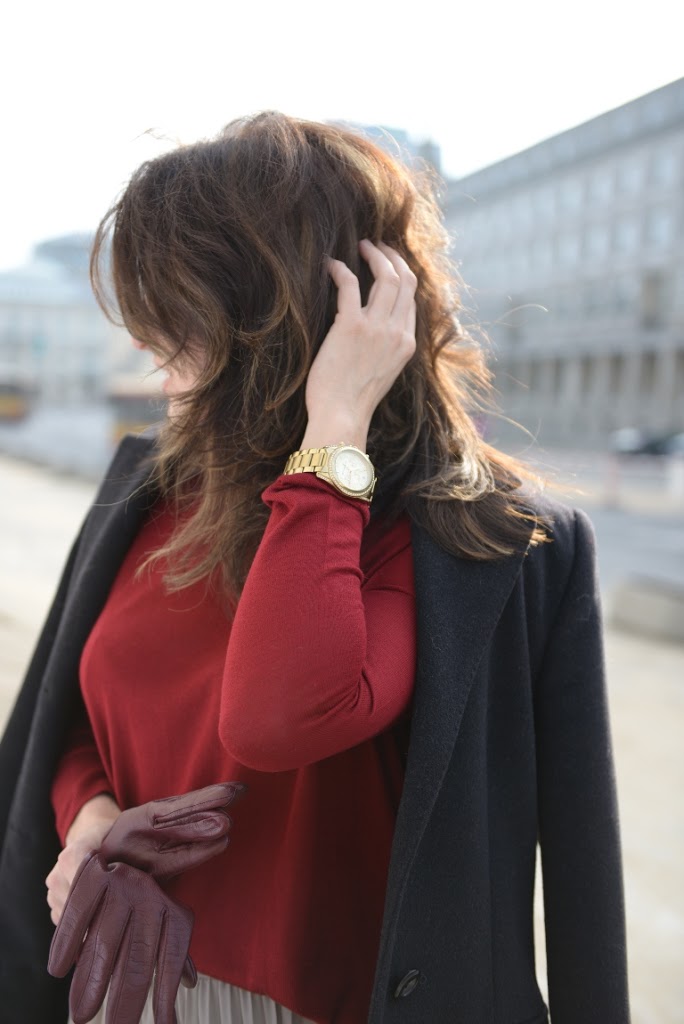 Piekne polaczenie kolorow! Burgund i szarosc – idealnie sie uzupelniaja….A fruwajaca spodniczka nadala calosci fajnej lekkosci. Ja Ciebie lubie w roznych wydaniach, ale chyba bardziej w tych elegancko-biurowych;)