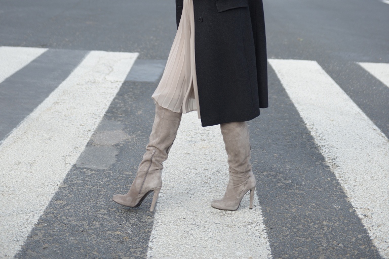 Twoja stylizacja super kobieca – piękne połączenie lekkiej spódniczki z kozakami i świetnym płaszczem.