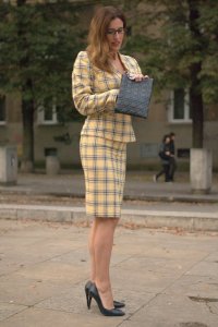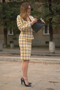 Piękna taliowana garsonka, trendy krata na pięknej i zgrabnej kobiecie.
