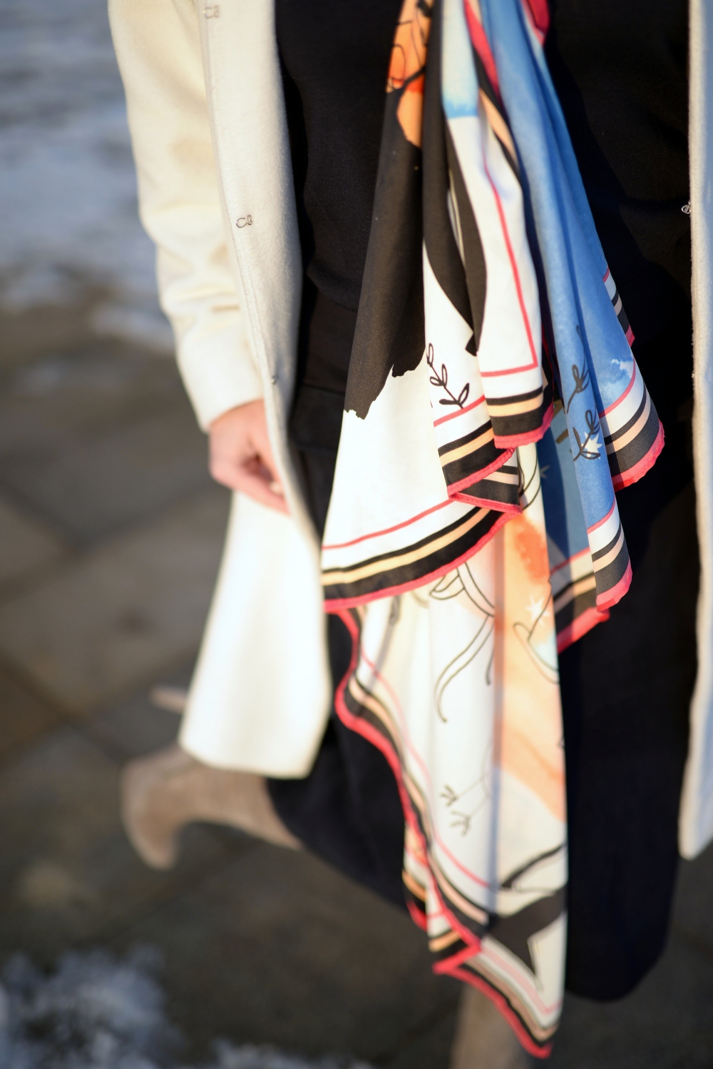 Posłużyłam się więc apaszką (wyprzedaż Promod 19 zł) o bardzo letnim, wakacyjnym wręcz wzorze. Wnętrze pod białym płaszczem jest granatowe. Lubię monokolorowe zestawienia, a granat często jest znacznie bardziej twarzowym kolorem niż czerń, która lubi odebrać nam świeżość. Perwersyjne wręcz byłoby kontynuowanie jednokolorowego granatu takimiż kozaczkami, ale nie mam.