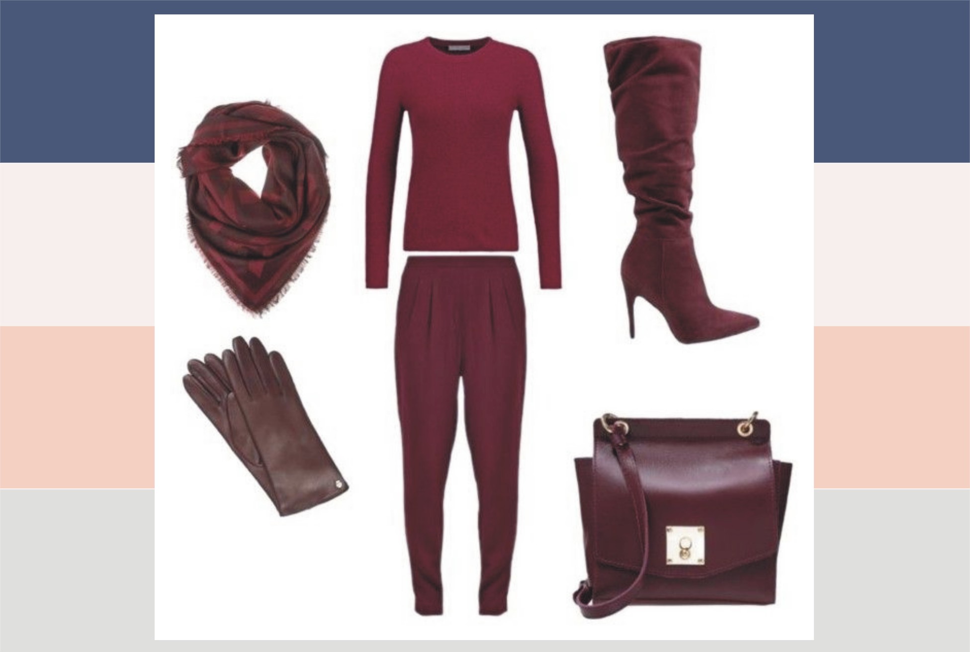 W poprzednim poście TU miałam „marsalową” szarfę i torebkę . A poniżej wybrałam jeszcze klika elementów.