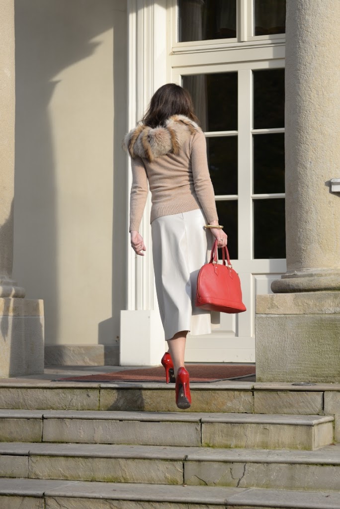 Szanowna Pani , uważam , ze ta kreacja nie jest elegancka. Niedopiety sweter, starawy lisek no i ten odcień czerwieni… Może gdyby zamiast czerwonych dodatków użyto pieknego , eleganckiiego koloru bordo….rownież w kolorze szminki wskazane byloby eleganckie bordo tak modne w tym sezonie. Spódnica no i oczywiście uroda Pani to potencjał tej stylizacji.