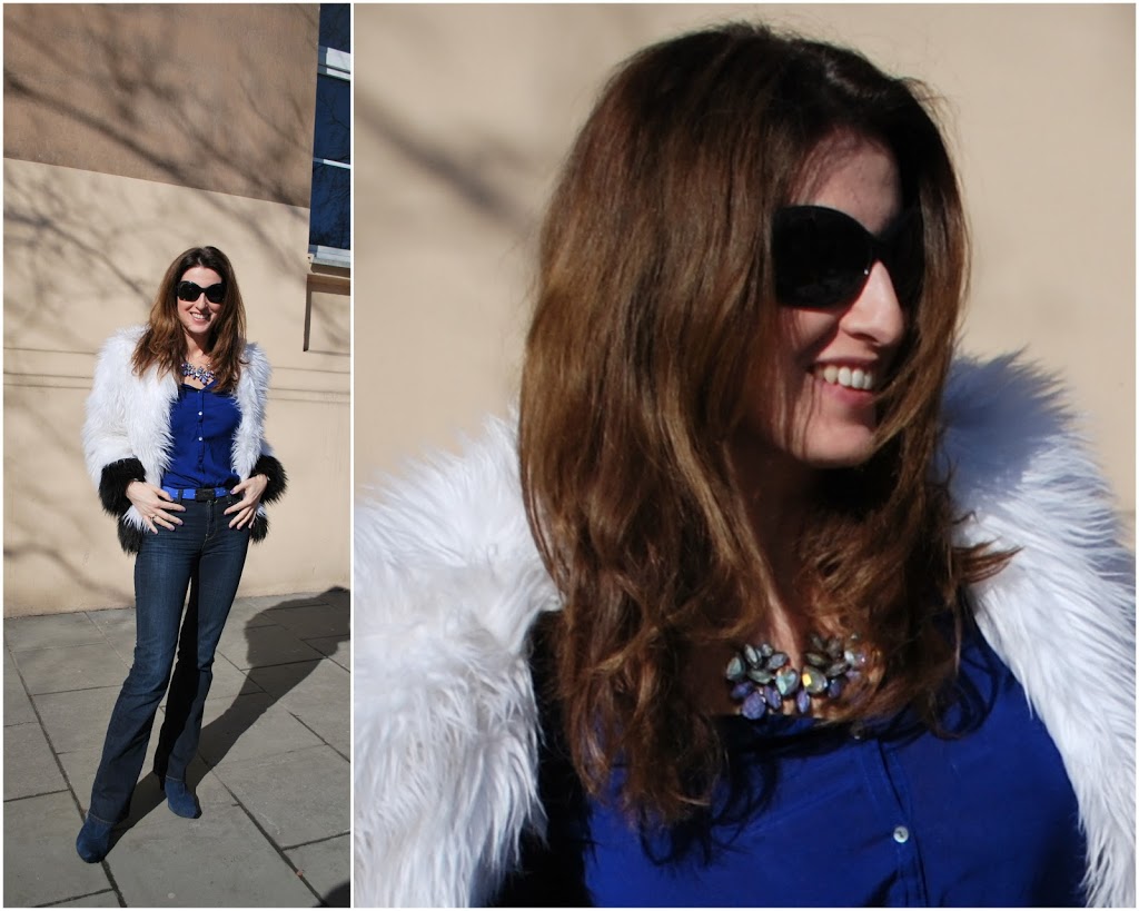 Jeden z wiosennych trendów to szafirowy kolor – najlepiej od stóp do głów. W części „od stóp” wystąpiły klasyczne dżinsy. Mimo ostrego słońca całość musiałam przykryć futerkiem, moim ulubionym w tym sezonie, dlatego tylko wybaczam jeszcze te mroźne temperatury 🙂