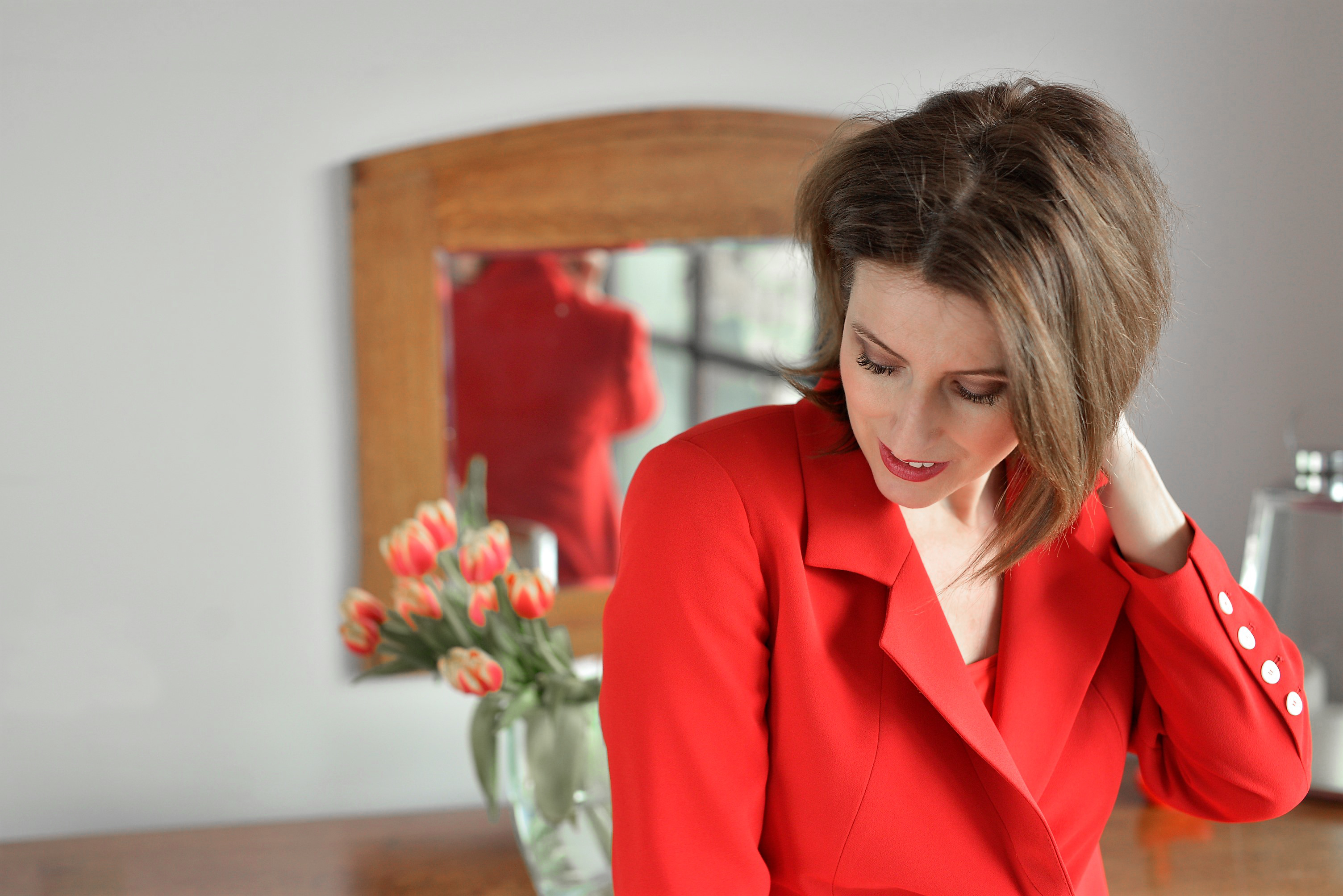 Dziś zatopiłam się w energetycznej czerwieni garnituru, który – dzięki dodatkom z białych guzików – zyskuje na świeżości.