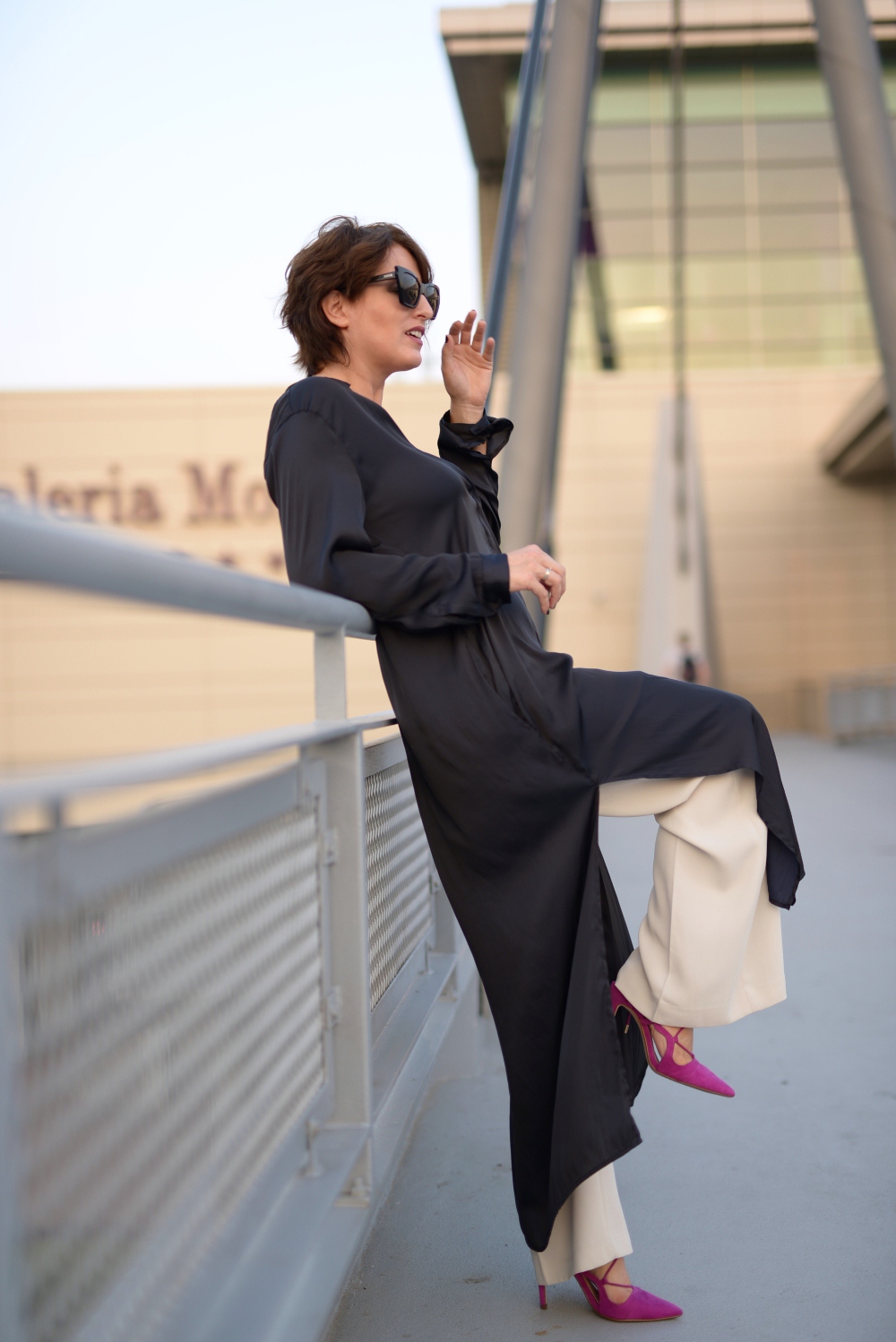 Też porwałam się na niego i wybrałam gigantyczną satynową koszulę w kolorze mrocznego granatu.