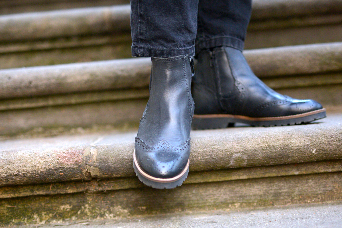 Do kompletu – skórzane sztyblety, których brązowy akcent wpisuje się w moją gamę kolorystyczną. Polubiłam się ostatnio z płaskimi obcasami. Kiedyś uważałabym to za objaw starzenia się – takie sięganie po wygodniejsze buty. Ale dziś uważam, że to dość stylowe.